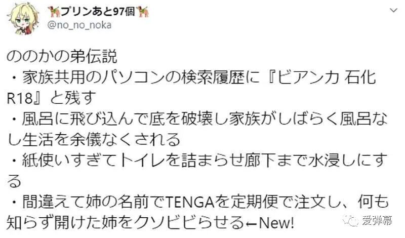 「我弟的传奇事件:①在全家共用的电脑留下各种『不堪』的搜寻历史②跳进浴缸撞破底部,害全家好一阵子不能泡澡③上厕所用太多卫生纸塞住马桶,害走廊淹水然后最新的是④误用姊姊的名字买飞机杯,吓坏不知情开箱的姐姐。