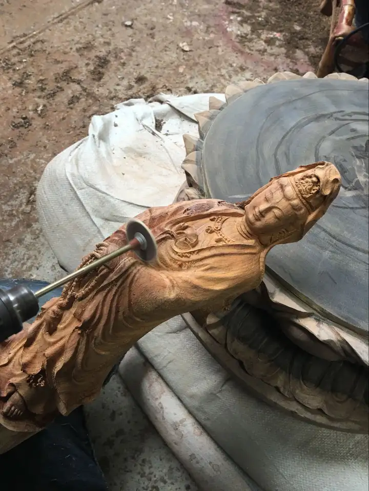 打磨:根据佛像需要,讲木雕用粗细不同的木工砂纸磋磨,要求先用粗砂纸,后用细砂纸。要顺着木的纤维方向打磨,甚至理想效果。