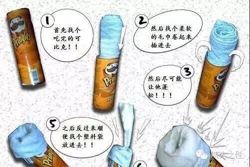 自制步骤: 1.首先找一个吃完的桶装薯片包装桶 2.找一个柔软的毛巾卷起来插进去 3.然后尽可能让毛巾蓬松 4.之后反过来,找一个柔软的塑料袋放进去 5.大功告成,你可以开始了! 二、自慰杯的自制教程之洗碗海绵简易版