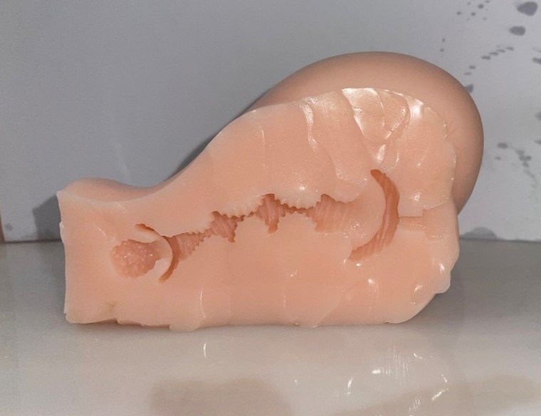 在中间通道部分,中间通道采用水平皱纹模仿真实的腔结构,中间有三对凸起的大肉球,让通道突然收紧,模拟突破感,然后做子宫设计,有颗粒状凸起,是头部最后的按摩刺激。
