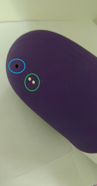 背后可看到充电构造是磁吸式的(下图绿色圆圈处),此外还有一个耳机孔(下图蓝色圆圈处)。