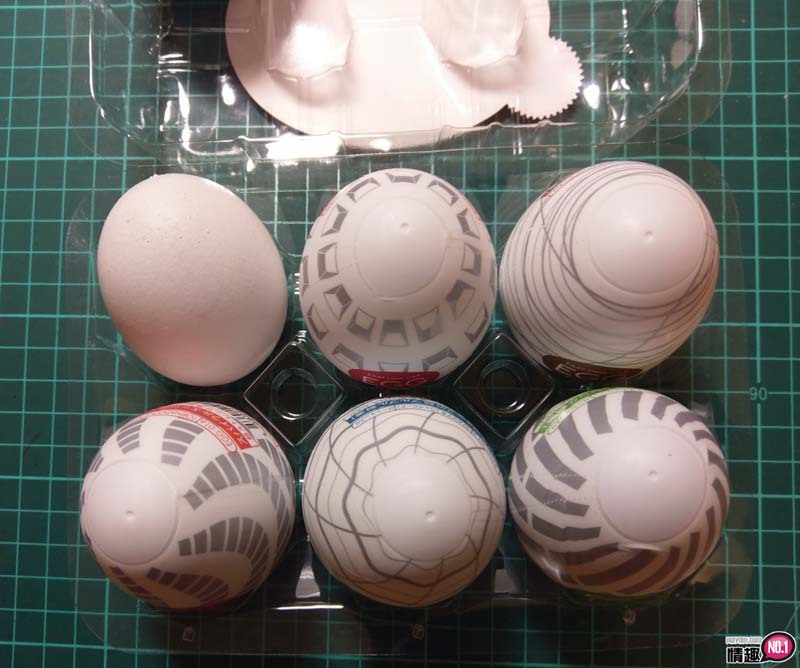 好啦,这个就是「TENGA 10周年全面进化自慰蛋6入」正面照片。第一眼看到就觉得,这个不就是平常买鸡蛋的透明塑胶盒包装吗?太夸张了吧,该不会是直接拿卖鸡蛋的来用吧。哈~哈~哈~好了,打开鸡蛋塑胶盒(自慰蛋)印入眼帘的就是六颗不同款式的自慰蛋。