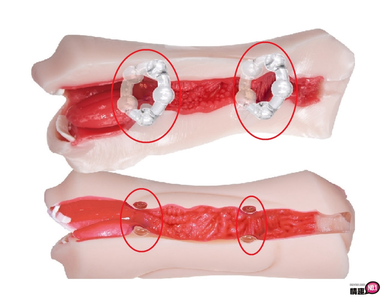 红色圈圈的部分是一个极窄的构造,在通过这个地方的时候会有很强烈的收缩感,中段的部分比较宽阔,但是给小兄弟的刺激一样不会少,图中逼真的颗粒还有肉壁会不断的摩擦你的龟头前段。