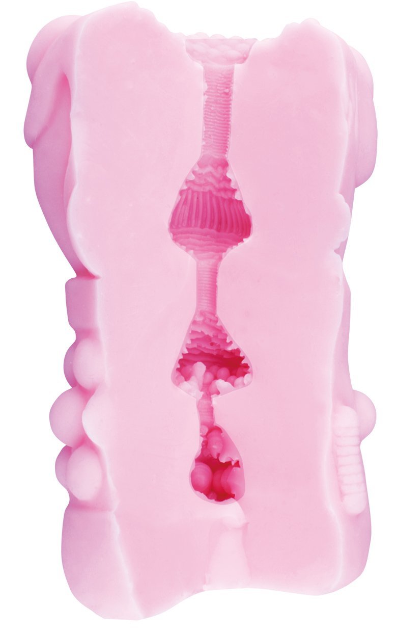 剖面图上可以看到有很多狭窄的路径后街上开阔空间,之后有接着狭窄路径,阴茎插入时会明显感受到一层一层突破关卡的感觉,第一段是纵横环纹交错,第二段是布满肉刺,最后仿子宫的部分则是肉球,子宫前的路径有刻意做的很紧闭,在清洗的时候灌水进去还排不出来在下方形成一颗大水球,如果没有及时发现应该已经胀破了。