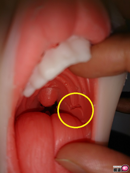 口腔就几条纹理而已,在进入食道时,就被扁桃腺的设计阻挡去路,这是「鬼技口交V」的第一道关卡。「鬼技口交V」在舌头后方突然变窄,一插进去爽度瞬间增加,这里除了模拟扁桃腺的设计( 下图中的黄圈部分 ),还有许多圆形的突状物( 下图中的蓝圈部分 ),简称小肉球。