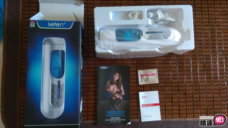拆开后的内容物,除了今天的主角之外还有一本使用手册及保固书,另外还附加了一小包的润滑液,分量之小,真的只能用一次。看到了主角之后,总觉得它好像一根砲管,旁边的吸盘是砲架。使用手册里面非常贴心的除了有中英文版的说明之外,还附上了日文的使用说明,让我们知道我要怎幺拆解这根大型「阴道」。
