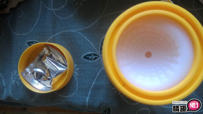 拿出来大概像这样,有附上润滑液一包,两侧皆可打开,本体身上也有商标。重点是底部有气孔,而这个气孔并非单个气孔,可以自行控制吸力,这点算是很棒的。入口处的形状也方便进入和上润滑液,这点也要加分。