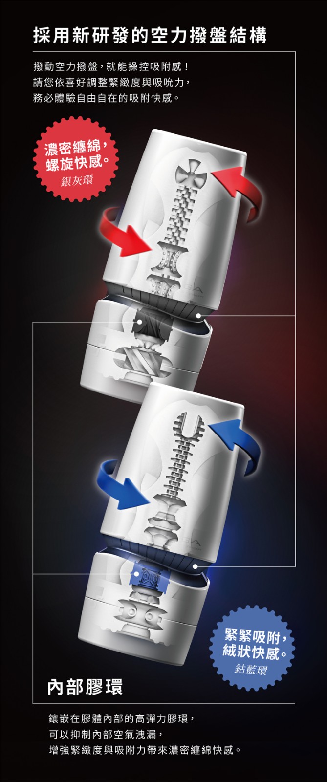 Tenga Aero的原理就是利用杯体的结构卡住飞机杯里面的胶体,当你旋转杯体时,胶体就会一起被卡住旋转,每个人感受的紧缩程度可能会因尺寸跟敏感度而异。
