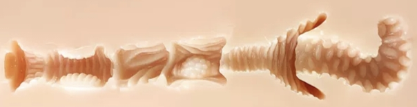 通道前部用周围的肉粒收紧,通过中间的螺旋和肉粒到达子宫。子宫内有小颗粒均匀分布。小孔通道整体宽松,余量大。