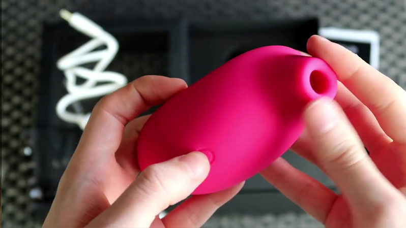取出吮吸按摩器,整体都是粉红色的色调,有一个吮吸口。上手的触感还不错,尺寸不算大,一只手就可以很好的握住。