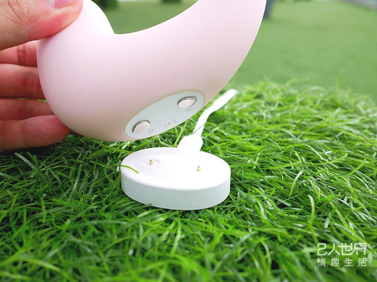 小海豹采USB充电,底部分别控制吸吮跟震动的按钮,同时也是充电的磁吸接点,对准充电座的接点放下后就可以充电了。