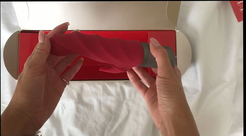 打开之后,可以看到里面是红色的锦盒,跟按摩棒的颜色相同。取出按摩棒,发现它的尺寸很长,足足有18厘米长。摸起来的手感也很不错。棒身的纹路特别多,使用起来的感觉肯定很好。